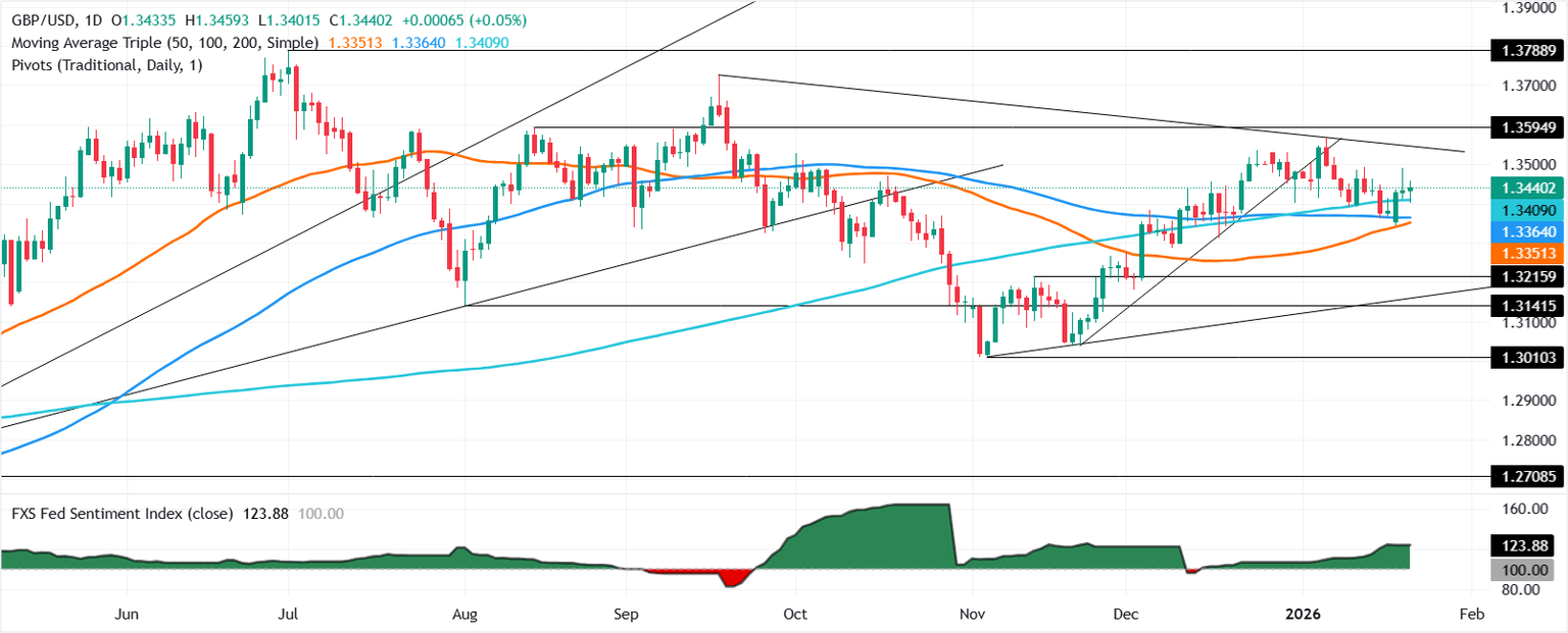 GBP/USD turns negative on the day following remarks by the US President Donald Trump in Davos who said that he would not use excessive force to get Greenland. At the time of writing, the pair traded at 1.3433, down 0.03%.