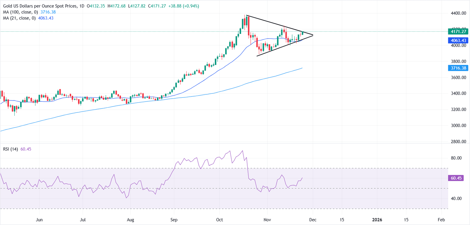 Gold (XAU/USD) edges higher on Wednesday as traders lean into a more dovish Federal Reserve (Fed) outlook, with XAU/USD trading around $4,171, near two-week highs after closing almost unchanged on Tuesday.