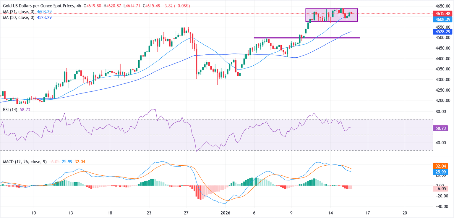 From a technical standpoint, XAU/USD appears to be entering a consolidation phase near record highs, with price action capped between the $4,580-$4,640 zone. Overbought conditions are discouraging buyers from aggressively chasing further gains for now, even as the broader structure remains firmly bullish.