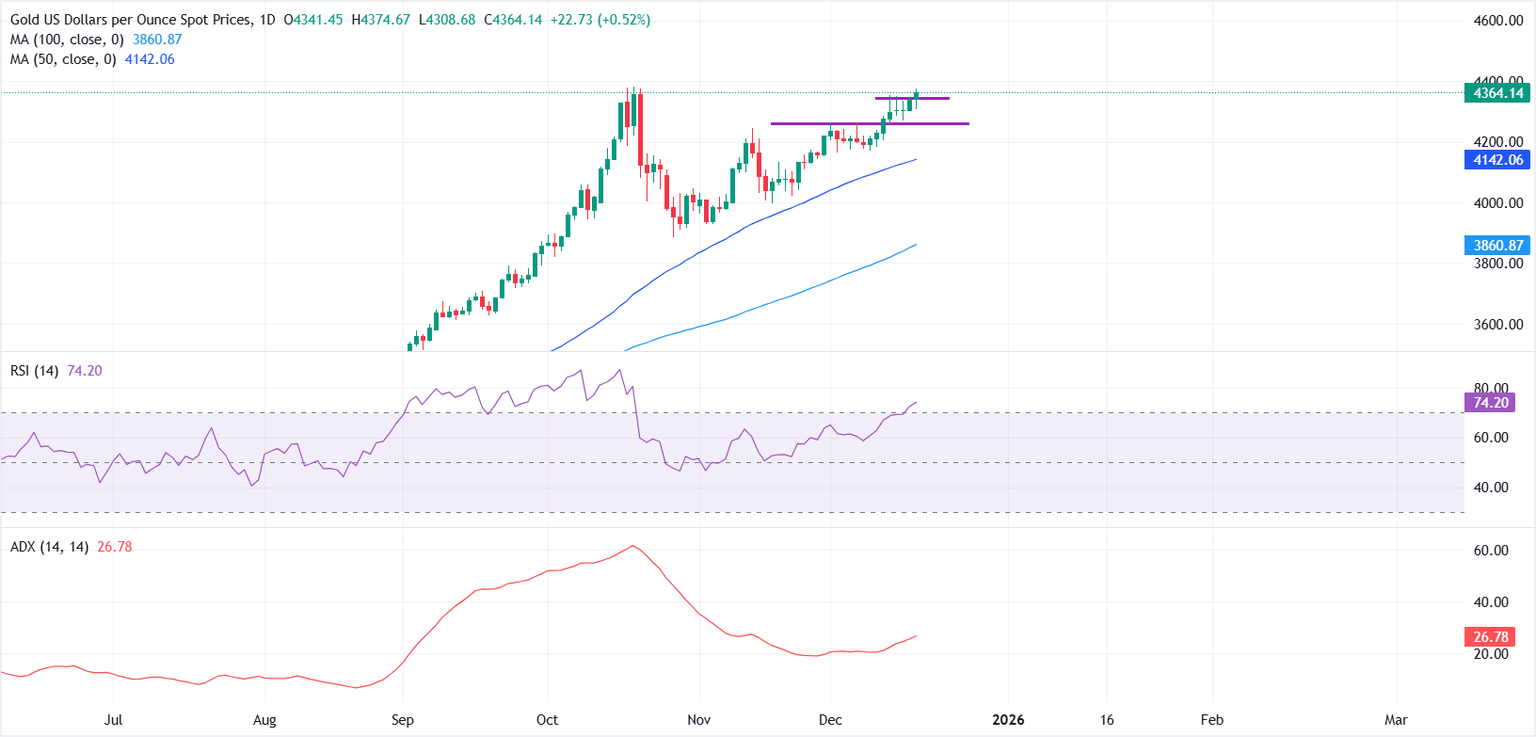 On the daily timeframe, the 50-day Simple Moving Average (SMA) rises above the 100-day SMA, with both slopes advancing and price holding above them, preserving a bullish bias. The 50-day SMA currently stands at $4,142, offering nearby dynamic support. The Relative Strength Index (RSI) at 74.64 is overbought and signals strong momentum that could precede a brief corrective pause.