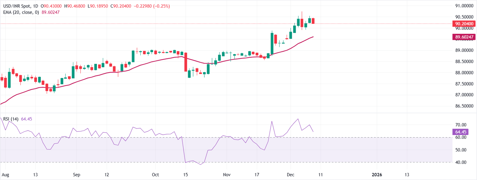 USD/INR trades at 90.3455 as of writing. The 20-day Exponential Moving Average (EMA) at 89.6159 rises, and the pair holds above it, keeping the bullish bias intact.