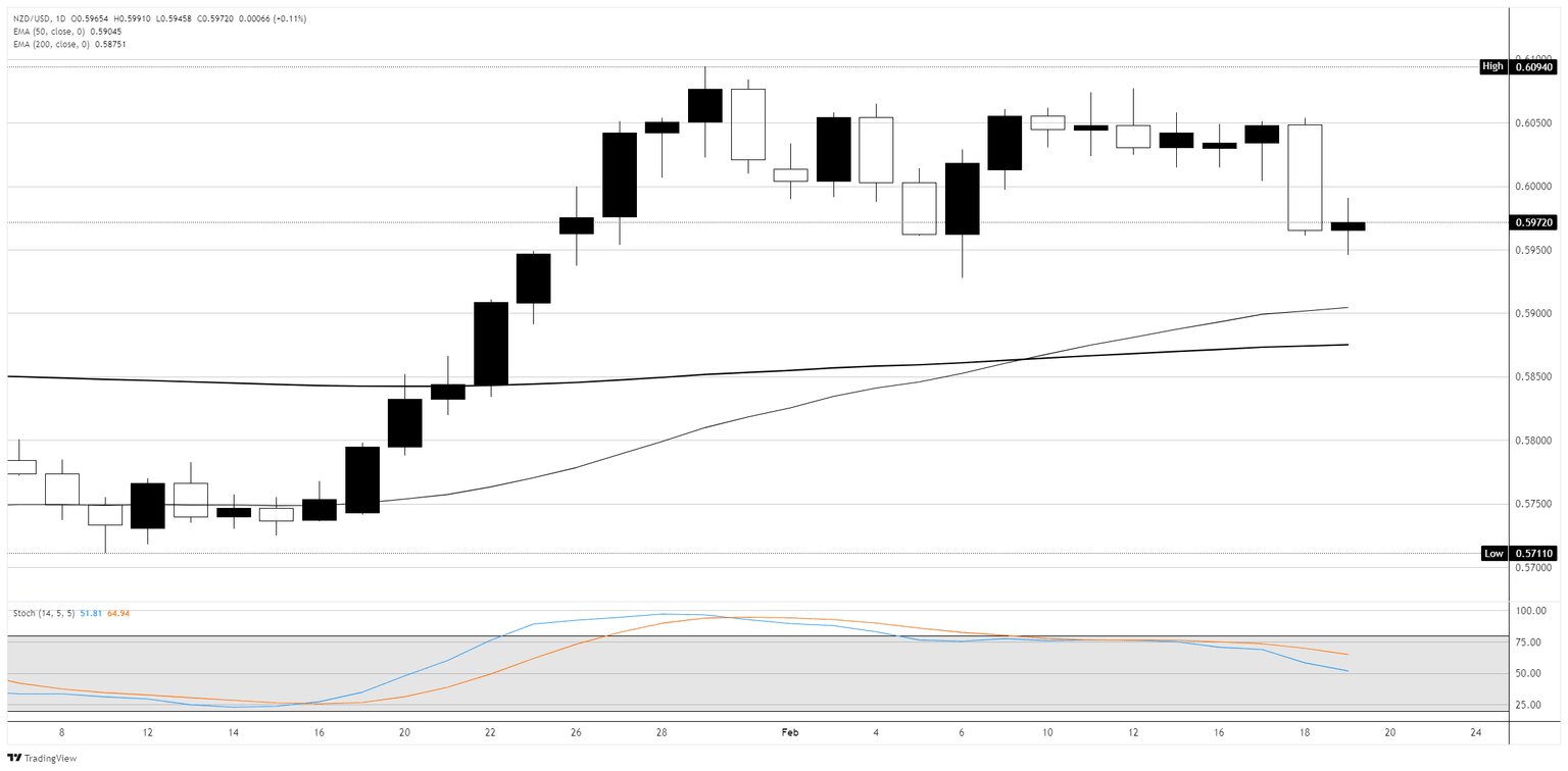 On the daily chart, NZD/USD tapped a fresh low of 0.5945 on Thursday, settling below the 0.6000 handle for the first time in over two weeks. The pair is still trading above the 50-day EMA at 0.5905 and well above the 200-day EMA at 0.5875, so the broader uptrend from the January lows near 0.5711 is continuing. However, the sharp reversal from the year-to-date high at 0.6094 has broken the consolidation range that had held since late January.