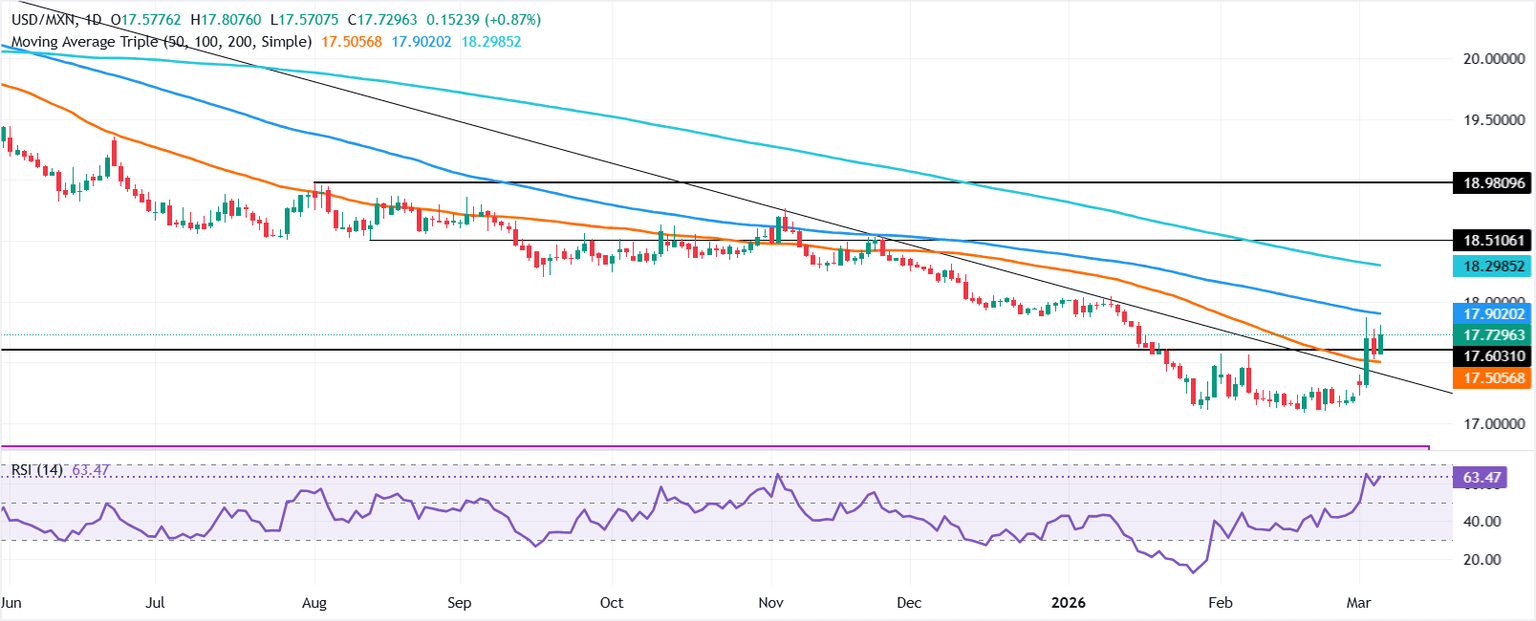The Mexican Peso (MXN) depreciates sharply on Thursday as hostilities intensify in the Middle East, triggering a flight to safety, which underpinned the US Dollar (USD). Additionally, solid jobs data in the US decreased the chances that the Federal Reserve (Fed) might cut rates twice this year. At the time of writing, the USD/MXN pair trades at 17.72, up more than 0.95%.